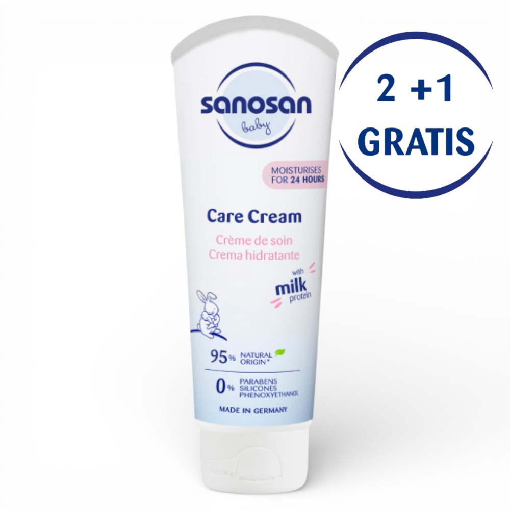 Pachet 2+1 gratuit cu trei creme hidratante sanosan baby 100 ml. Hidratare delicată pentru pielea sensibilă a bebelușului, în format economic.